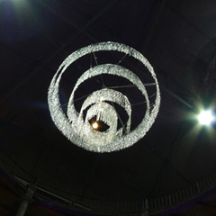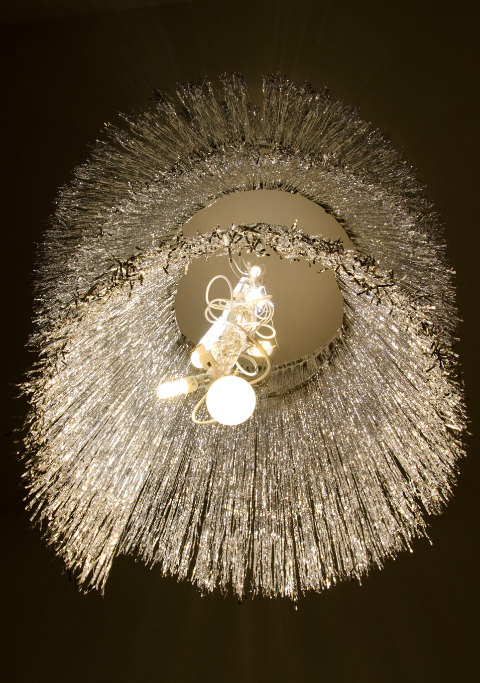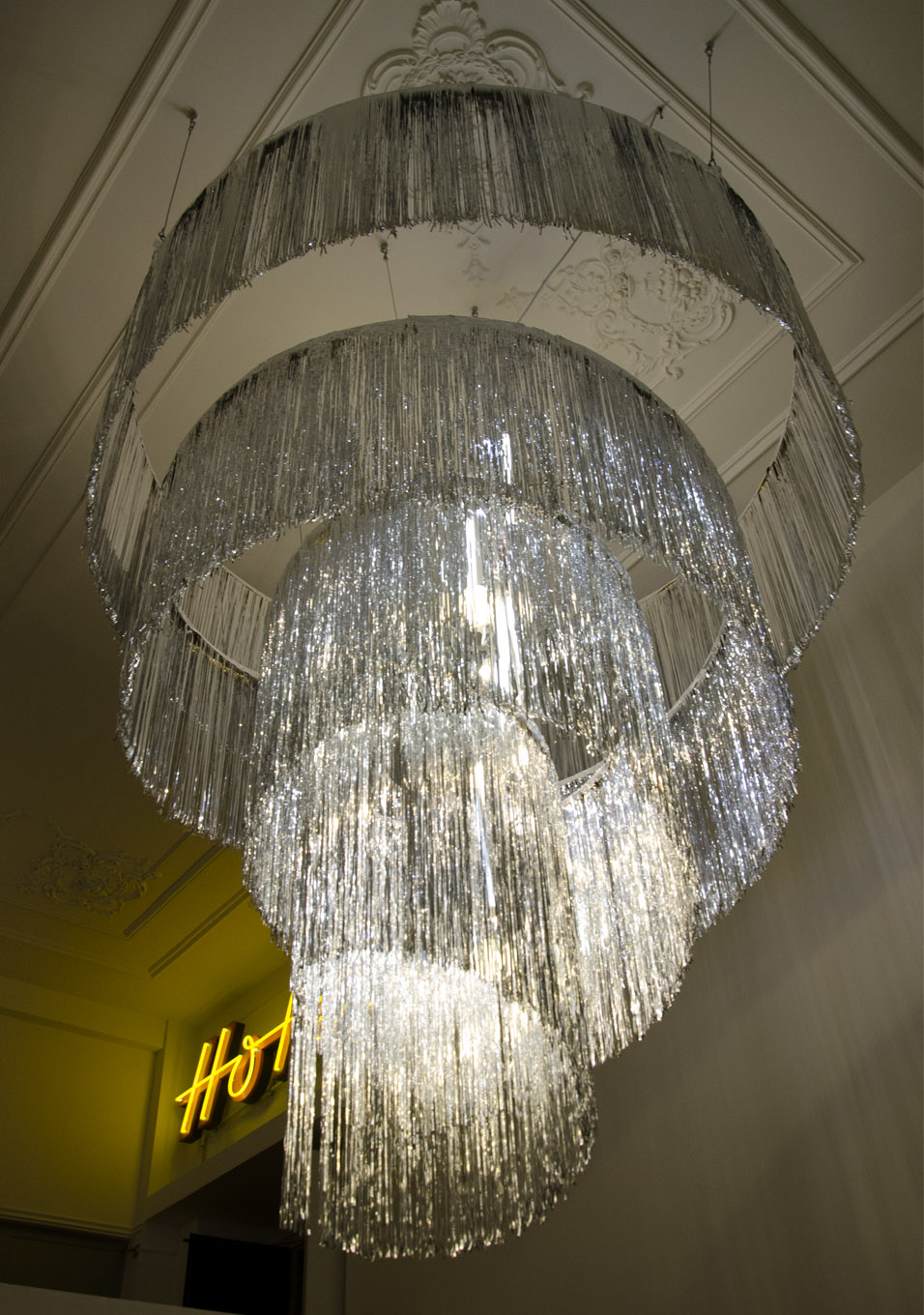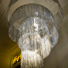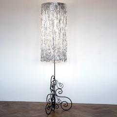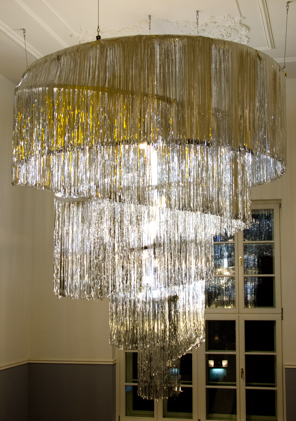 For the restoration of the Sofiensäle in 2013, Gorkiewicz designed a model of a chandelier that referred to Appel’s postwar creation. The work realigns a contemporary decorative chandelier; an object that is normally cheap and for temporary use.Each chandelier maybe viewed as an individual sculpture due to its dimensions and location within the space.