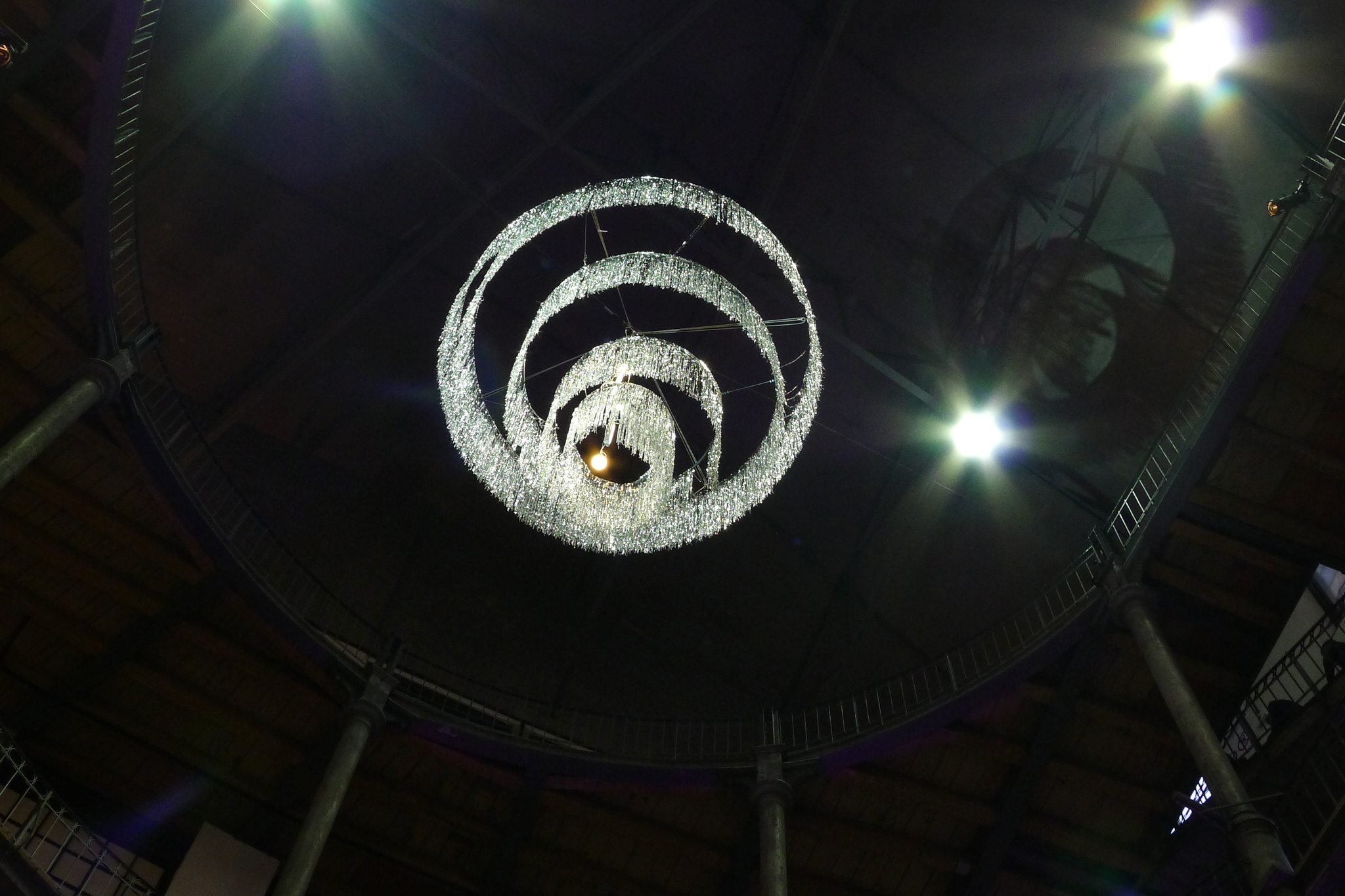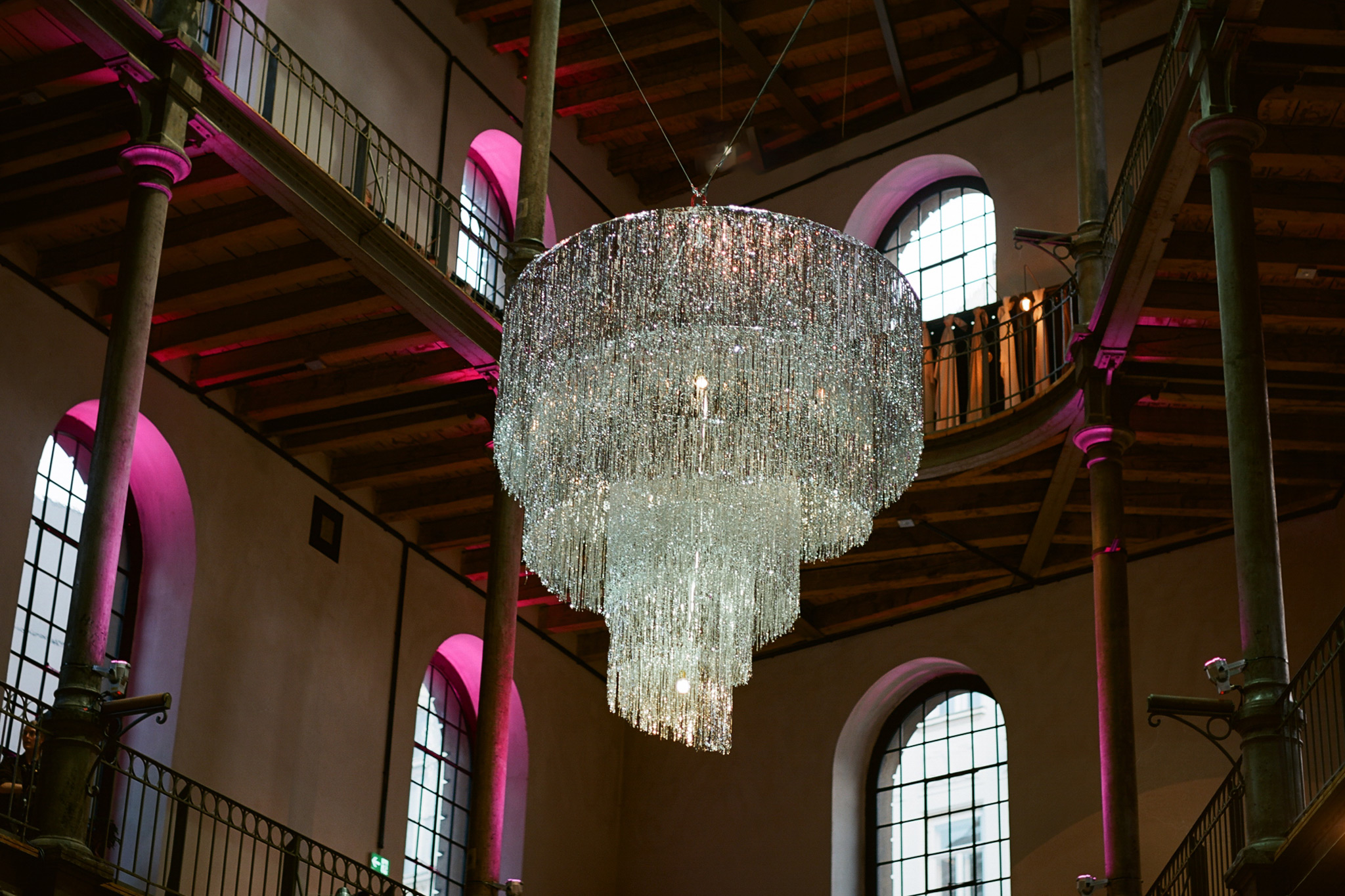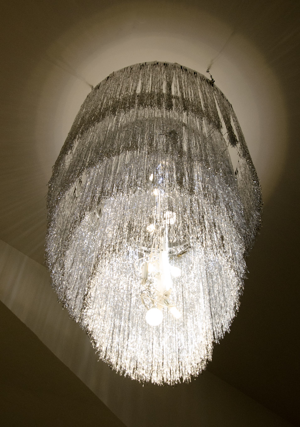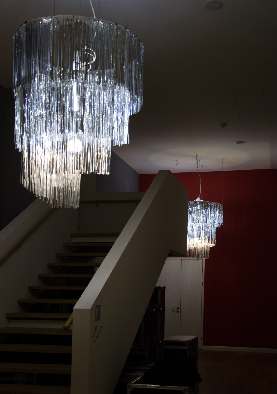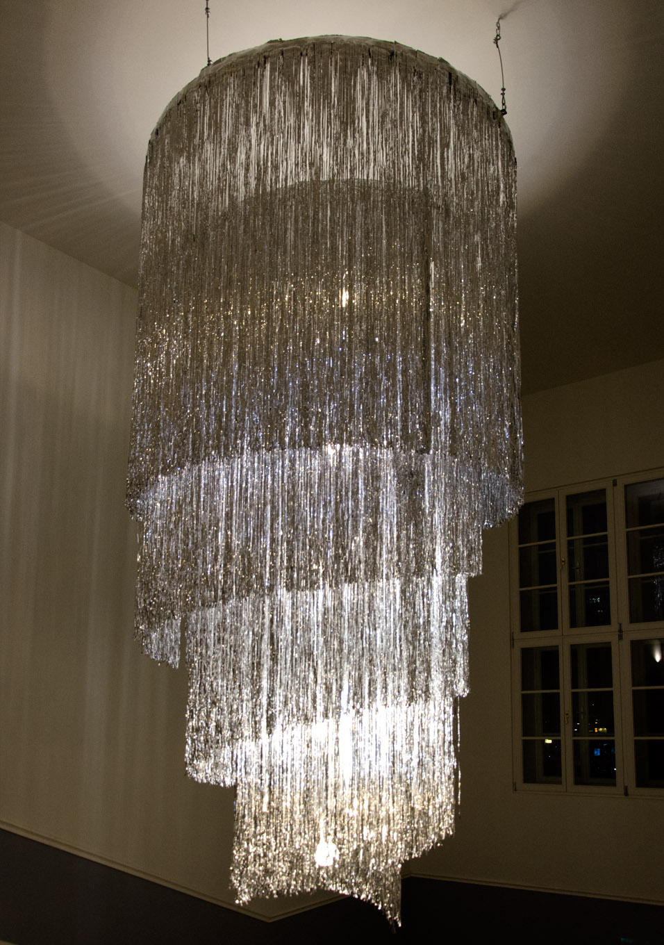 Due to destitute times after the war, Appel made chandeliers using cage fences by the company Hutter & Schranz, as well as leftover glass ornaments produced by the Lobmayr Company. The chandeliers were intended for temporary use, but remained until the entire building nearly burnt down in 2001.