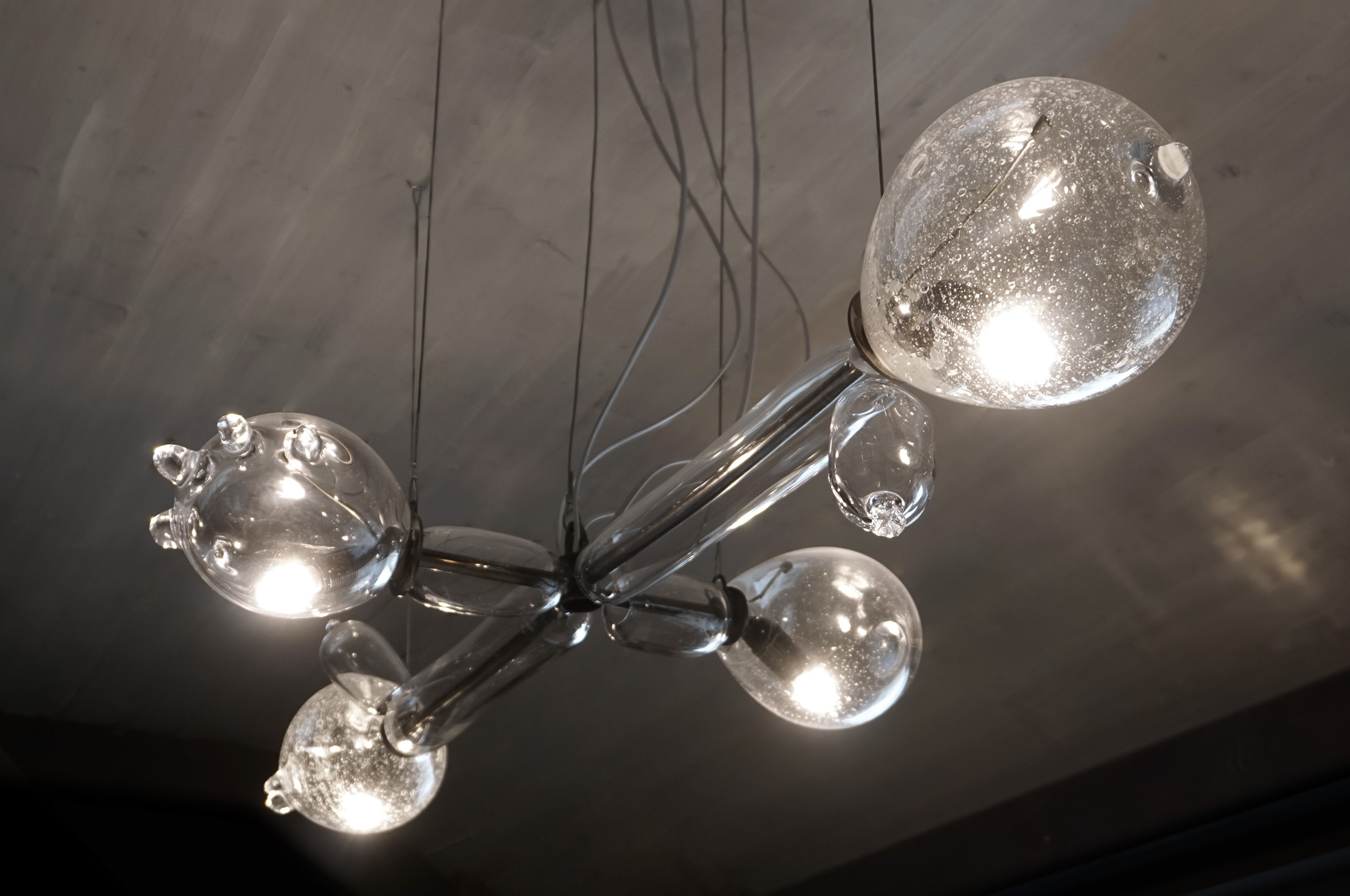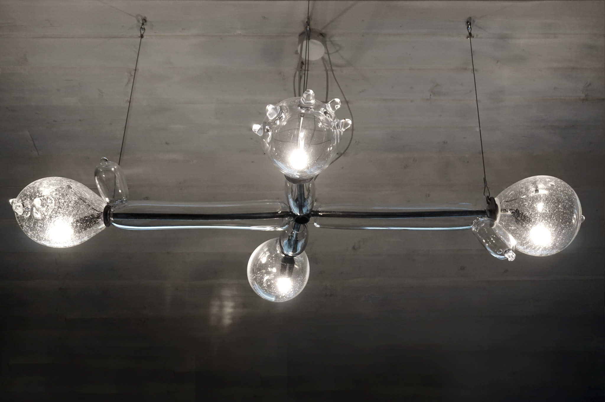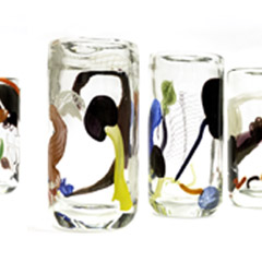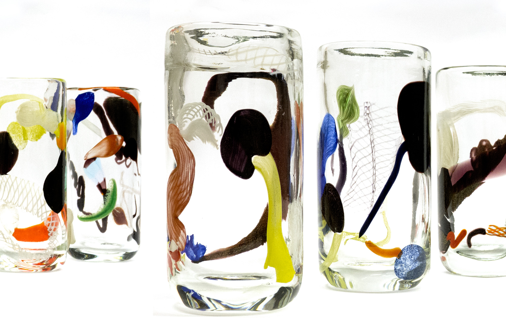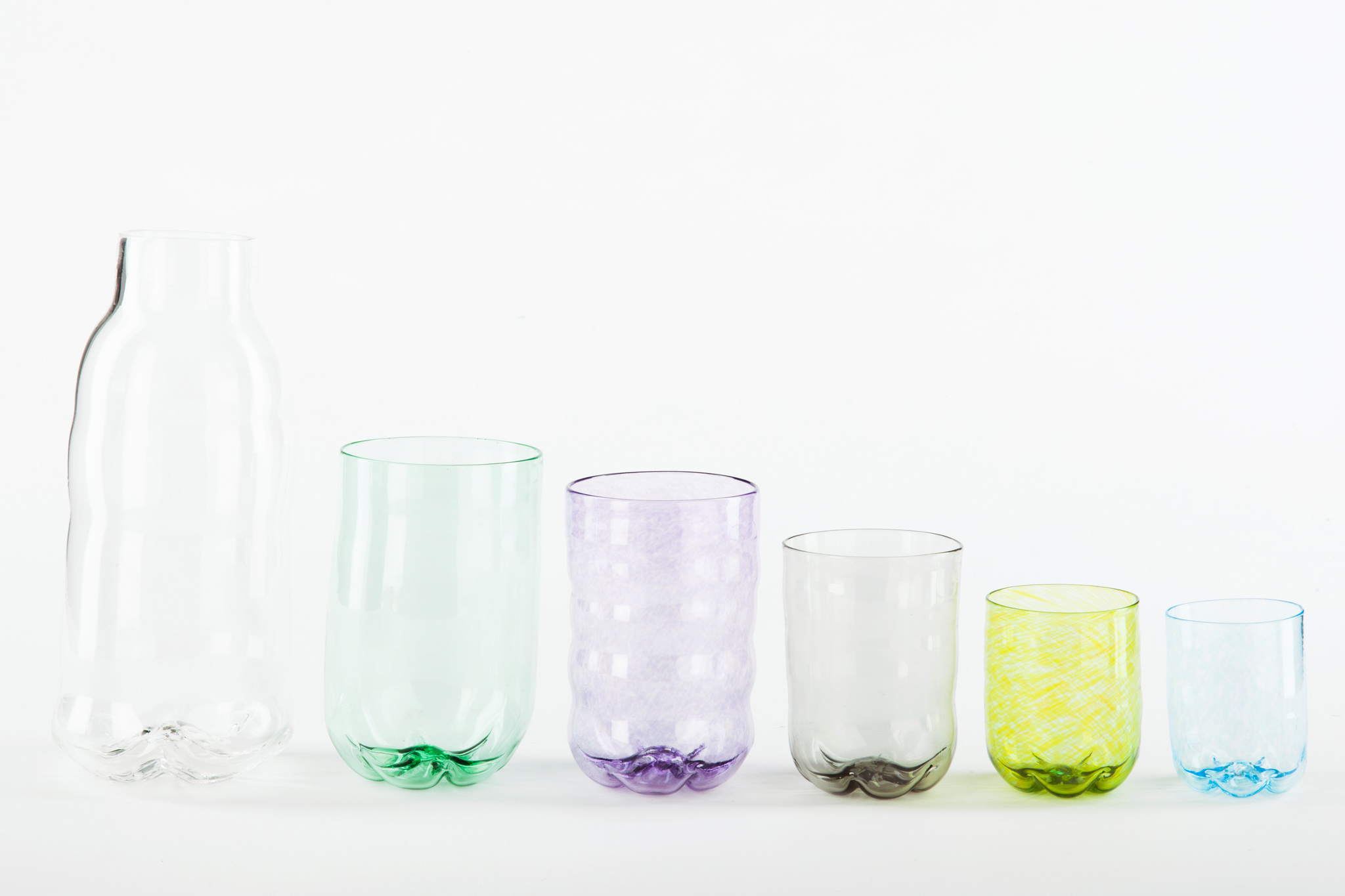 The principle behind Gorkiewicz’s glasses is apparently simple. Industrially-produced parts of plastic bottles, usually seen as the lowest form of beverage container, are mouth-blown by one of the greatest Venetian masters of the precious wine goblet. The irony is even deeper as Gorkiewicz is actually interested in the origins of the plastic bottle itself, which in turn refers to glass bottles.