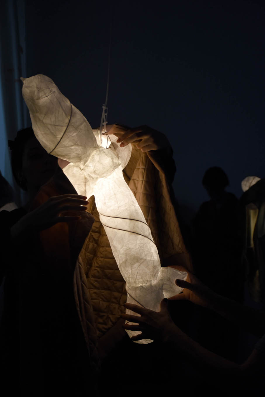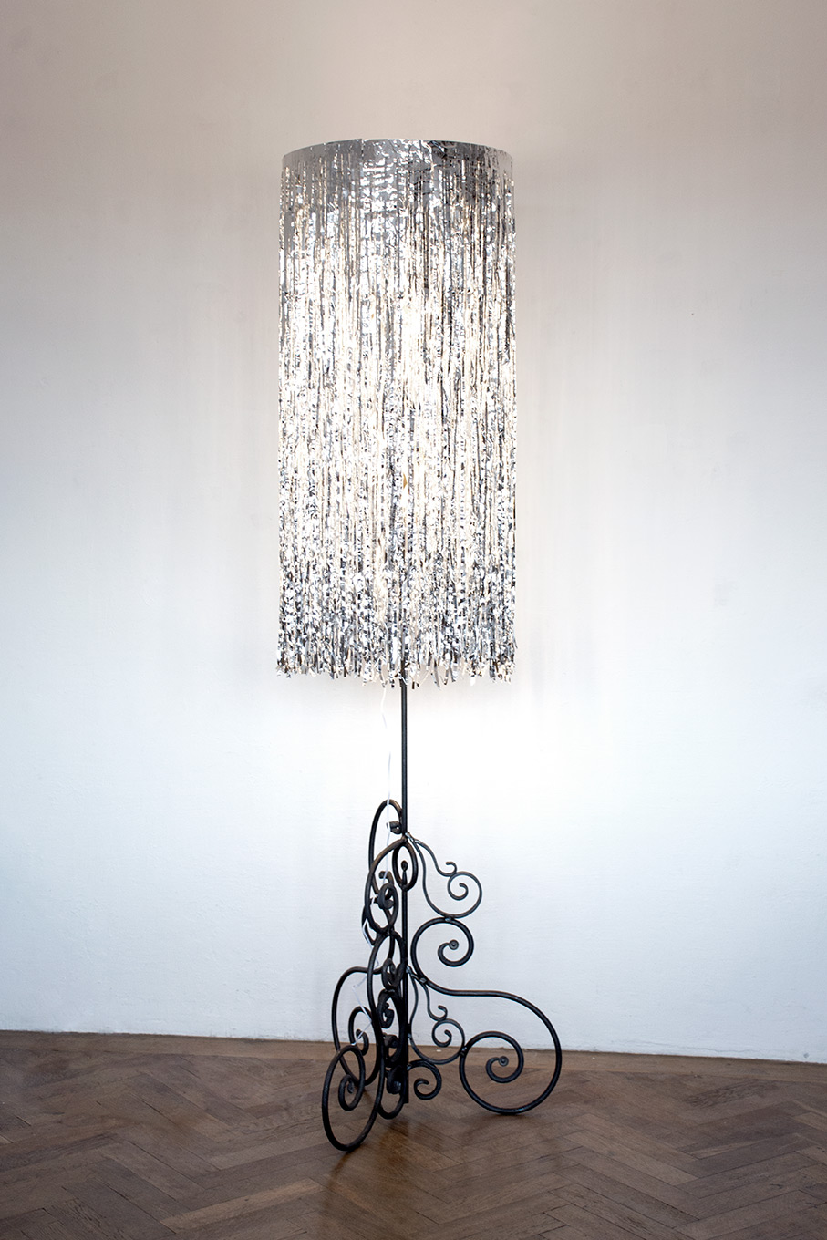 Gorkiewicz is well known for wading into design and architecture territory, radically rebranding even orthodox Beaux Arts architecture with delicate materials and forms that nonetheless go to the heart of a given context. The artist has strung tinsel of the kind that hangs around automobile showrooms outside nineteenth century palaces, and has covered walls with installations composed of lipstick marks. The delicate bottle-glasses are a subtle critique of consumption, offering a simple, elegant, artisanal and ecological alternative.