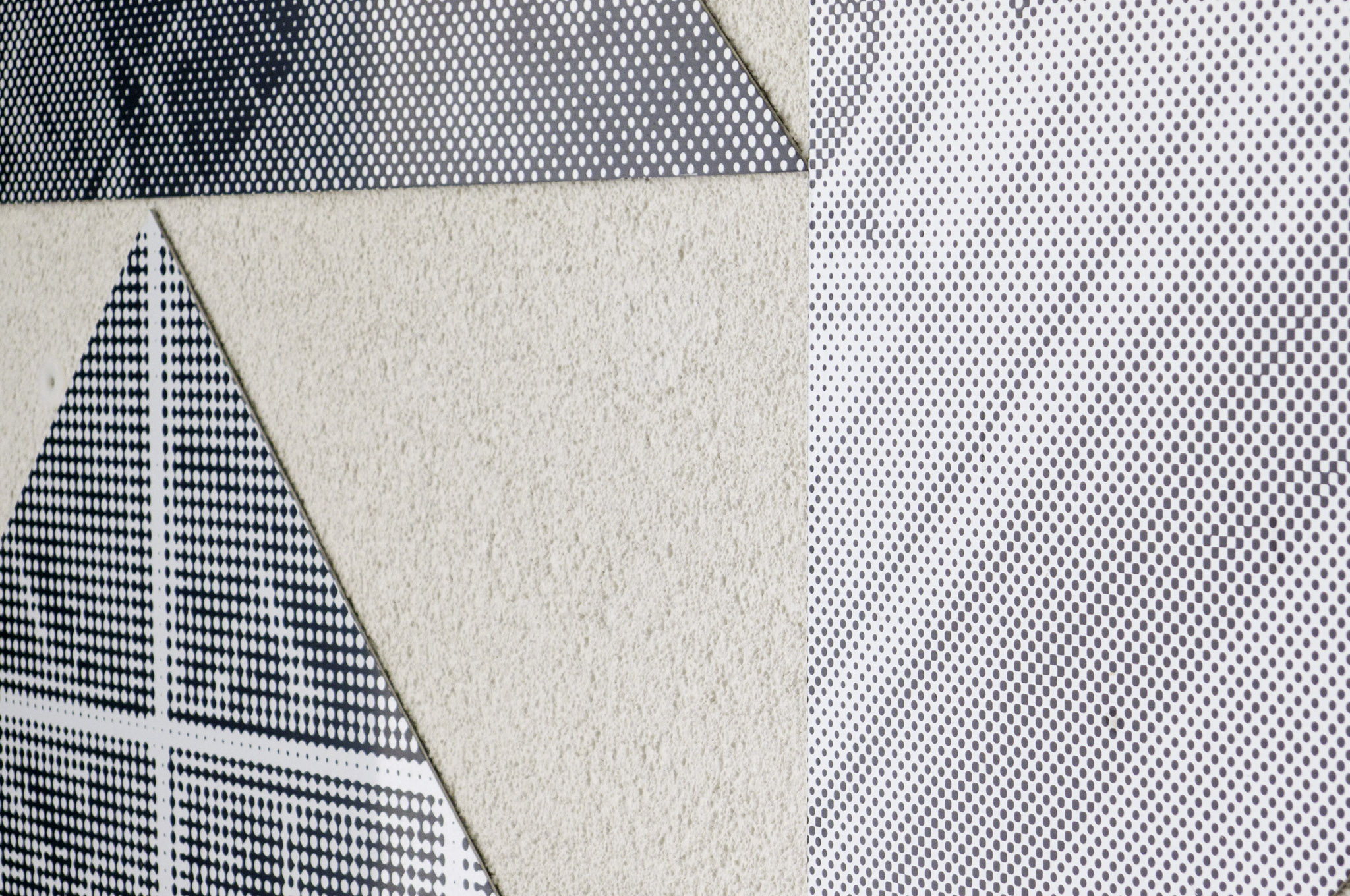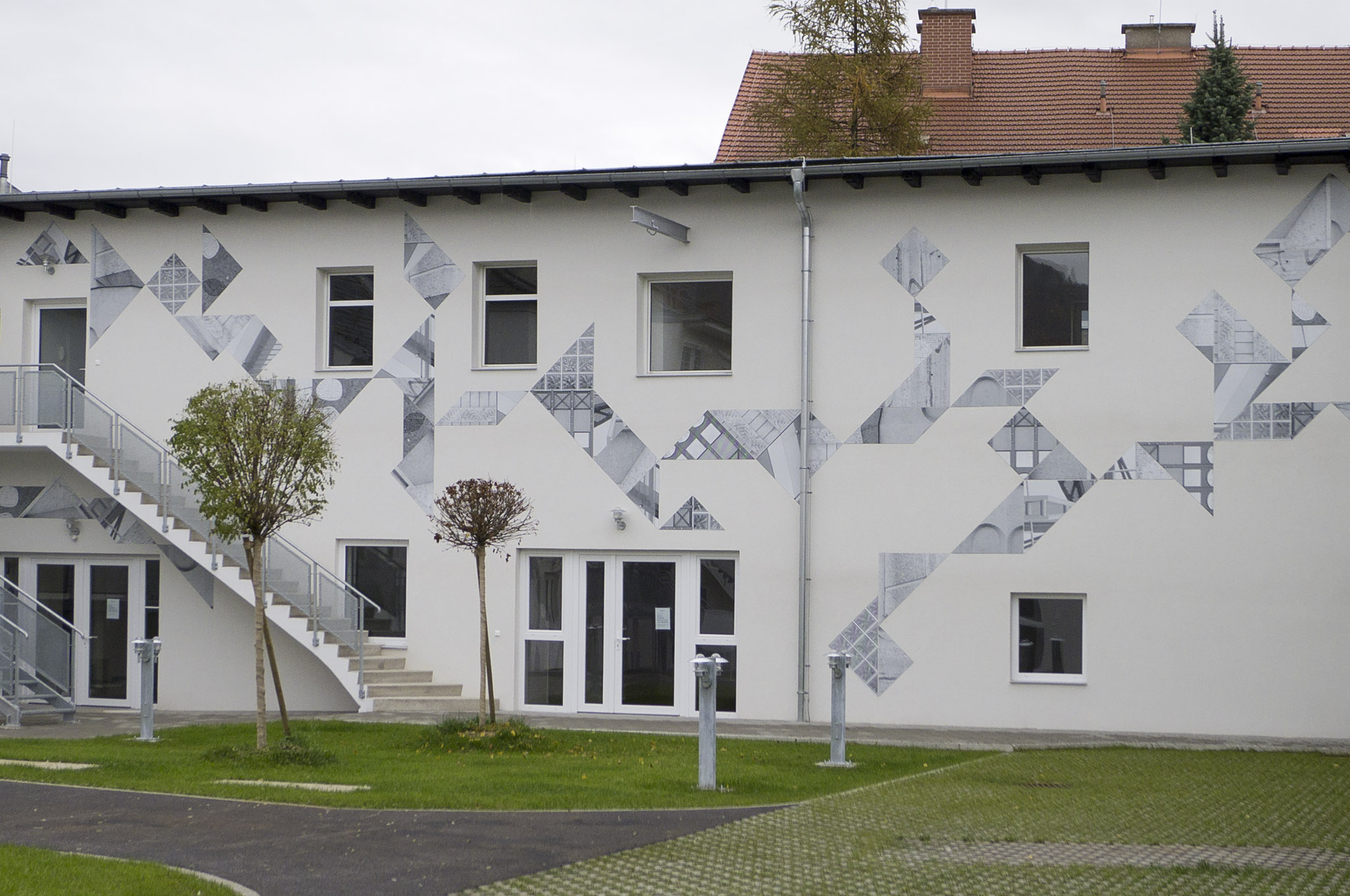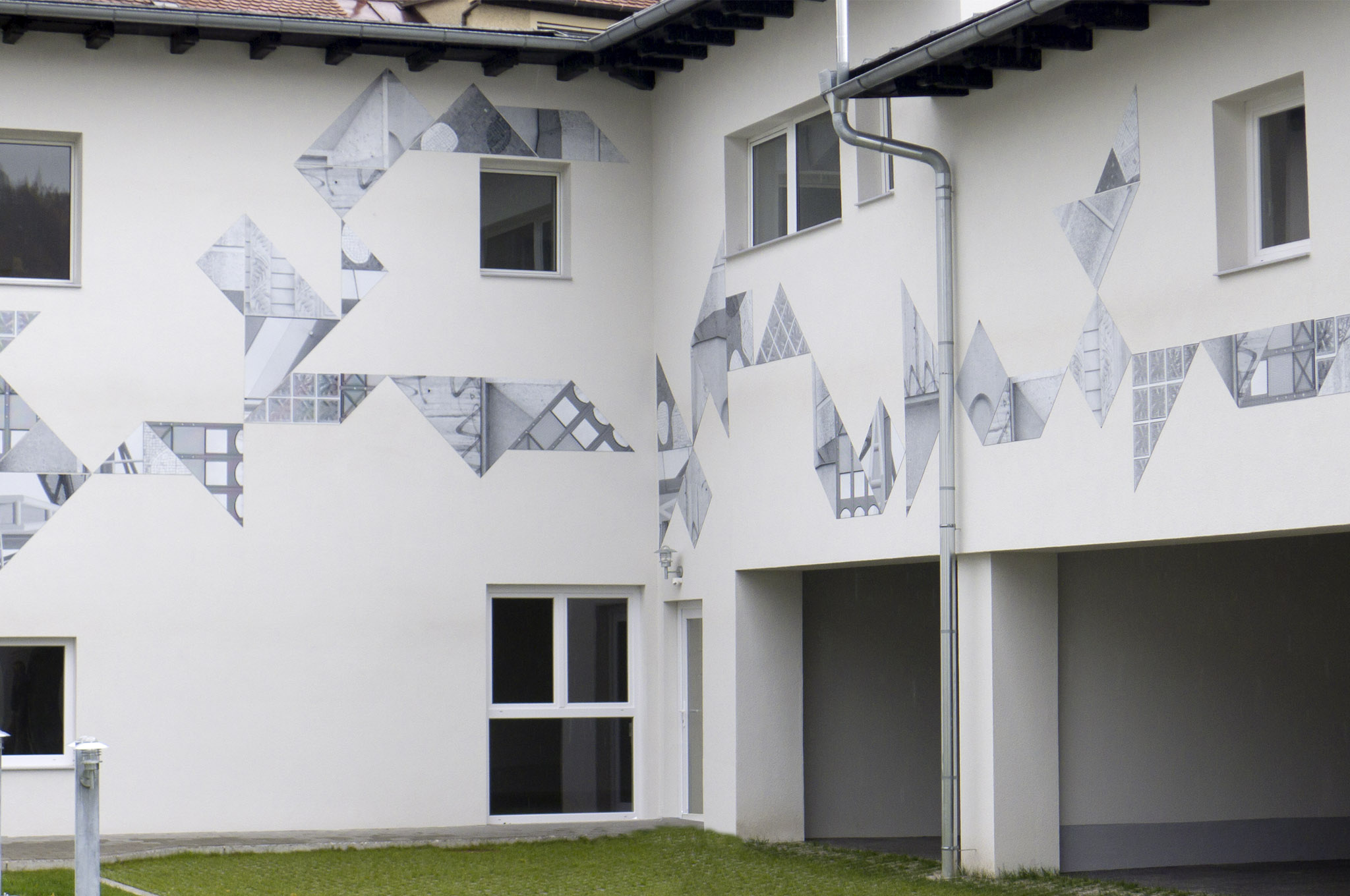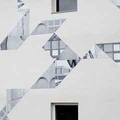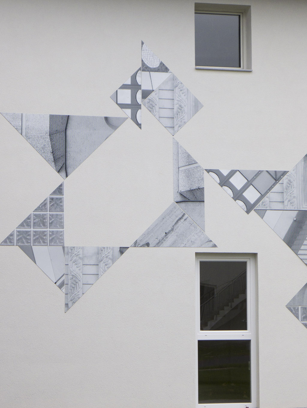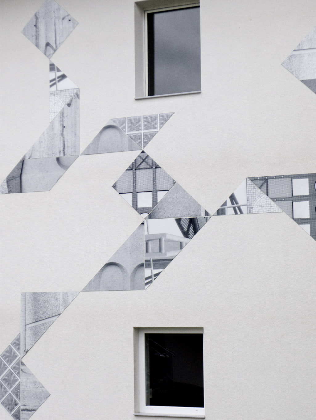 Each photo was printed in black and white on aluminum plates and cut into the shape of the Chinese game „Tangram“. These elements got mounted on the facade in the way Tangram elements fit-together. On the facade they cause a sort of trompe-l‘oeil effect.